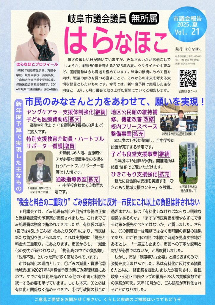 議会報告vol.21を発行しました🌻 2025.08.01 私の見解議会報告お知らせ議会質問活動報告 主に3月、6月議会で取り上げた質問を報告しています。 『ニュースダウンロード』に紙面のPDFをアップしています。ぜひダウンロードしてお読みください☺!