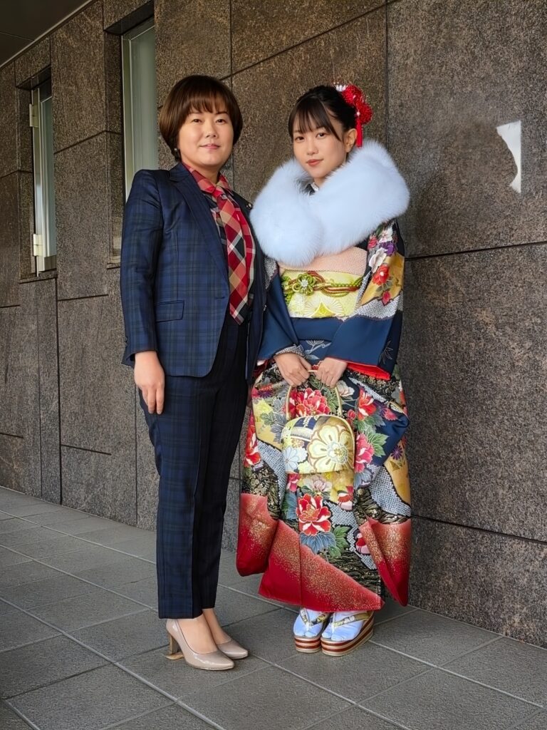 振袖は、私が二十歳の時に着たものを、娘が着てくれました。そして、私とは中学校時代から、娘とは生まれてからずっと親交のある友人が、着付けやヘアセットをしてくれました。本当にありがたく、幸せなひとときでした✨