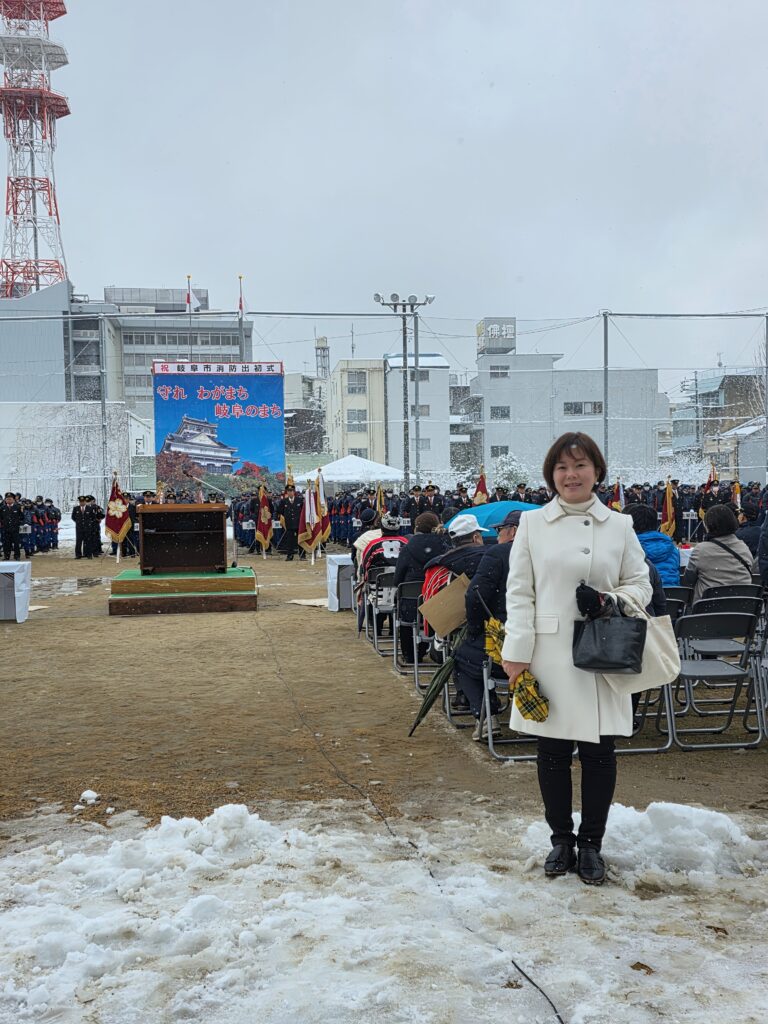 今年は久しぶりに雪の中での開催となり、私は加納東の女性防火クラブの一員としても参加しました。